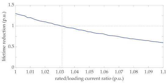 In order to analytically derive the increased rated current identified in Figure 9, Equation (36) was also applied with and . Coherently with the result of Figure 9, the rated current corresponding to the rated hot-spot temperature was equal to 1.032. This result once again shows the validity of the hypothesis that lifetime reduction is lognormally distributed, as derived in Figure 8.