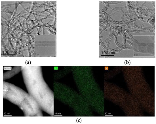 TEM micrographs of the 4.4 at.% N-CNTs as an example and CNTs are displayed in Figure 1. Ethylene decomposition is accompanied by the predominant formation of multiwalled carbon nanotubes. In their turn, N-CNTs have a distinct bamboo-like structure, which is known to form due to the curvature of nitrogen-containing graphene layers [31,32]. According to STEM-HAADF images with elemental mapping, nitrogen is uniformly distributed in N-CNTs.