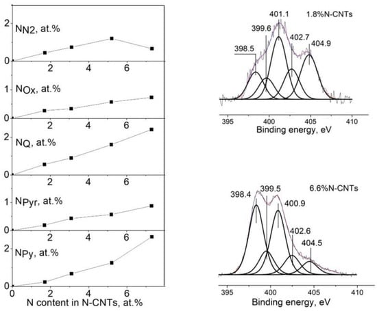 XPS revealed (Figure 2) that nitrogen in N-CNTs is in pyridinic (NPy, ~398 eV), pyrrolic (NPyr, ~400 eV), graphitic (NQ, ~401 eV), oxidized (NOx, ~403 eV) and molecular (NN2, ~405 eV) states [24,26,33]. The presence of molecular nitrogen encapsulated between graphene layers or inside channels is characteristic of bamboo-like N-CNTs [26,34]. An increase in the total nitrogen content in N-CNTs is accompanied by an increase in the content of all structural species. However, this changes the predominant species and the ratio of nitrogen species. In the N-CNTs with the minimum doping degree, the main contribution is made by graphitic nitrogen, and the NPy/NQ ratio is equal to 0.5, Table 1. As the total nitrogen content is increased, the contribution of pyridinic nitrogen grows; as a result, the NPy/NQ value achieves 1.2 in the case of 6.6 at.% N-CNTs.