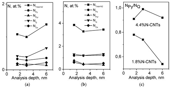 One can see that in both samples, nitrogen is incorporated in all structural positions of external/internal graphene layers and internal arches. The total nitrogen concentration profile along the analysis depth coincides to a greater extent with the profile of different nitrogen species, which is determined most likely by the catalytic growth mechanism of N-CNTs on the Fe catalyst with the equiprobable incorporation of nitrogen in different positions [24]. As seen in Figure 4c, when the entire tube wall (ca. 6 nm) or only its external/subsurface layers (ca. 1.5 nm) are analyzed, NPy/NQ, ratios for 4.4 at.% N-CNTs virtually do not differ. In the case of 1.8 at.% N-CNTs, as the depth of analysis is decreased, the NPy/NQ ratio increases by a factor of ca. 1.6. Nevertheless, our study of N-CNTs with the minimum depth of analysis allows a conclusion that external layers of N-CNTs, irrespective of the doping degree, are slightly enriched with graphitic nitrogen.