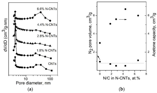 (a) Pore size distribution curves and (b) N2 pore volume and acetone capacity of the CNTs and N-CNTs.