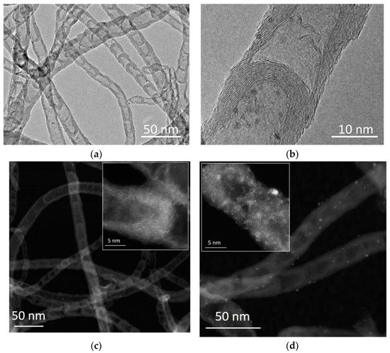 (a,b) TEM images of 2% Pd/N-CNTs; HAADF-STEM images of (c) 0.2% Pd/N-CNTs and (d) 2%Pd/N-CNTs