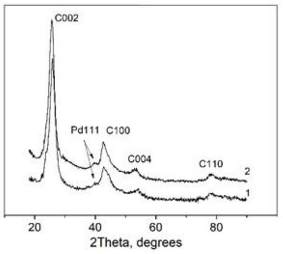 XRD patterns of 2% Pd/N-CNTs (1) and 2% Pd/CNTs (2).