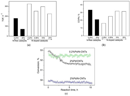 As shown by the catalytic experiments, isolated palladium ions are more active than metallic palladium nanoparticles, and the maximum TOF value is observed on the 0.2% Pd/N-CNT catalyst. A strong interaction of palladium with the pyridinic centers of N-CNTs is responsible for high stability of the catalyst in the course of the reaction as compared to the N-free catalyst (Figure 8c). Presumably, activity of the catalysts with high palladium content is determined by the ratio of two palladium species and by the size of metallic nanoparticles. In comparison with N-free catalysts, selectivity on all the N-doped catalysts increased by 5%, which corresponds to nearly a four-fold decrease in CO concentration. Additionally, the discovered stability of the catalyst 2% Pd/N-CNT compared to 2% Pd/CNT confirms the stabilization of both palladium species (isolated ions and metal nanoparticles) by nitrogen centers [49].