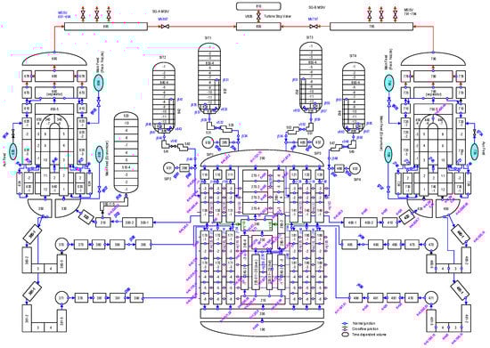 Figure 1 shows the nodalization of APR1400 under investigation. The APR1400 includes a reactor vessel and a reactor coolant system (RCS) with two closed loops connected in parallel. The reactor core consists of 241 fuel assemblies with a core thermal power of 3983 MWt. Each loop has one SG, two RCPs, and a pressurizer (PZR) connected to one of the RCS loops. The RCS operates at a nominal pressure of 158.2 kg/cm2A. The reactor coolant enters the reactor vessel, flows downward between the reactor vessel shell and core barrel, flows up through the core, leaves the reactor vessel, and flows through the tube side of the two SGs where heat is transferred to the secondary system. The RCPs return the reactor coolant to the reactor vessel.