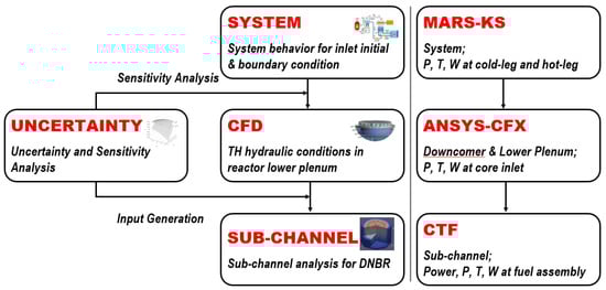This study evaluated the asymmetric events with at least four codes: system code, CFD software, sub-channel analysis code, and uncertainty tool. First, the system behaviour of asymmetric events was analyzed using a system code, multi-dimensional analysis for reactor safety—KINS standard (MARS-KS) []. The main outputs were the mass flow rate, temperature, and pressure in the cold leg and hot leg, where it is essential to evaluate asymmetric phenomena in the core region during a transient. Second, a commercial CFD code was used to calculate the distribution of the mass flow rate and temperature at the core inlet based on the system results from MARS-KS. This step was able to identify the three-dimensional distribution of coolant at the core inlet. It played a key role in investigating the pattern of the core flow distribution and the range of uncertainty of the flow rates. The uncertainty tool generated 124 inputs for sub-channel analysis code to obtain the DNBR at 95% reliability and 95% accuracy level over the uncertainty range and form [,]. Finally, the sub-channel analysis code numerically calculated the DNBR based on the uncertainty range with respect to the asymmetric mass flow rate and temperature. Figure 2 shows the code system and flow of information to evaluate the DNBR in this study.