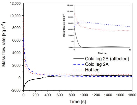 Figure 3 shows the mass flow rate transient up to 1800 s in each loop. The reactor coolant flow rate showed significant core asymmetry between the affected and unaffected loops. Moreover, a large amount of reverse flow was observed for several seconds in the loop where the RCP was locked, in contrast to the FSAR assumption. However, the mass flow rate was temporarily increased in the unaffected loop due to the high driving force compared to the affected loop.