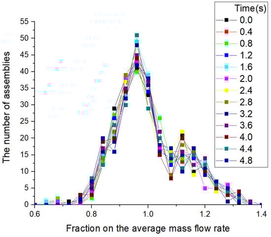 Figure 6 shows the number of fuel assemblies on the flow rate distribution at the core inlet. During the RCP rotor seizure event, the flow distribution in the reactor became slightly uniform as the coolant flowed toward the core. However, the flow rates in some fuel assemblies were lower than those in the normal operation conditions. The minimum flow rates were calculated as 65% and 66% in two assemblies at around 0.4 s.