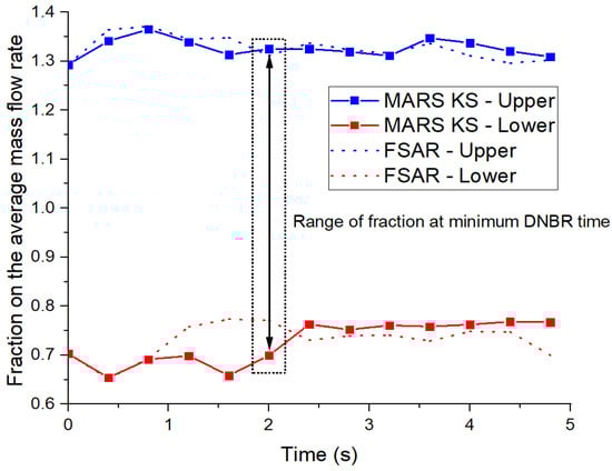 Figure 7 shows the range of core inlet flow over transient time to determine the uncertainty of the core flow asymmetry. As final values of the uncertainty, a mean value of 1.0 and a standard deviation of 0.230 were identified with a normal distribution. At 2.1 s, when the DNBR showed a minimum value from the system results, the fraction range of core inlet flow calculated by the CFD was from 0.699 to 1.325. Compared with the FSAR results of APR 1400, the total inlet flow into the entire core was more conservative than that of the MARS-KS results, because the FSAR assumed there was no flow in both directions as soon as the transient initiated. However, given the reverse flow rate bypassing the core immediately after the accident, the MARS-KS results could be smaller than the FSAR values with respect to the inlet flow to a fuel assembly. In other words, when the reverse flow of core inlet flow was more realistic, it could be concluded that the DNBR at fuel assemblies of the FSAR was likely to be less conservative.