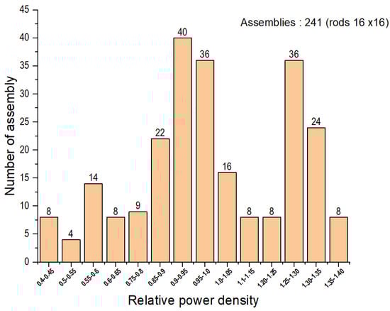 The power distribution of the entire core fuel assemblies of the APR 1400 was investigated and divided into 14 groups to provide crucial thermal boundary conditions for the sub-channel analysis. Figure 9 illustrates the number of assemblies on the relative power density for 14 groups. The number of fuel assemblies does not show normal distribution. Thus, the thermal boundary condition to obtain 124 samples for the power range was assumed to be uniformly distributed to ensure conservative results.