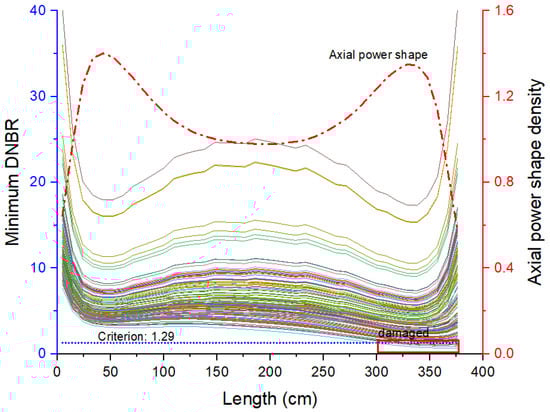 Figure 10 shows the calculated DNBR according to the length of the fuel assembly when both the distribution of the core inlet flow rate and the uniformed power distribution of 124 inputs to all fuel assemblies were applied. The DNBR properly reflected the thermal power trend. Six cases including 3rd DNBR did not meet the acceptance level of 1.29. Furthermore, they failed to satisfy the acceptance criteria at higher elevations above 300 cm. One can observe that the larger the thermal power was, the faster the DNBR occurred. As shown in Figure 10, it was expected that there would be several damaged fuel assemblies. However, this result did not show the exact place where the damaged fuel assemblies were located.