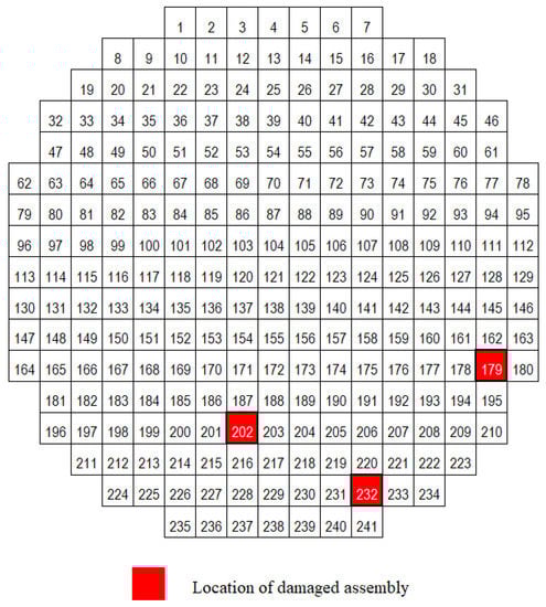 To figure out the exact locations and number of damaged fuel assemblies, the minimum core flow rate that did not cause the DNBR was analyzed by applying gradually increasing flow rate in the individual range of core inlet flow on the 14 power groups. The DNBR up to power group 11 met the acceptance criteria even though the minimum core flow was applied to the individual power groups. However, it was shown that power groups 12, 13, and 14 must increase the core flow rate by 72.6%, 76.4%, and 80.6%, respectively, to meet the acceptance criteria. Based on these screening, three fuel assemblies with location numbers of 179, 202, and 232 in the 14 power groups did not meet both the power density and core flow criteria. Table 3 shows the fuel power density and individual core flow range of the fuel assembly that is expected to be damaged. In addition, Figure 11 illustrates the locations of the damaged fuel assembly.