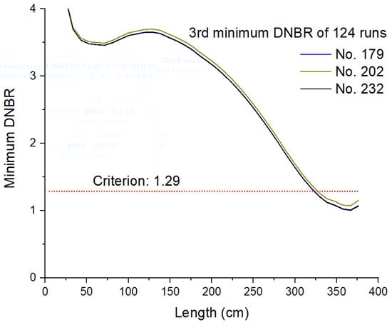 It can be confirmed that the fuel assembly is damaged if the third minimum DNBR of 124 runs at location numbers of 179, 202, and 232 does not meet the acceptance criterion while the individual ranges of core inlet flows are applied. Figure 12 shows the third minimum DNBR of 124 runs in the individual flow range, and it is observed that all cases do not meet the acceptance criterion.