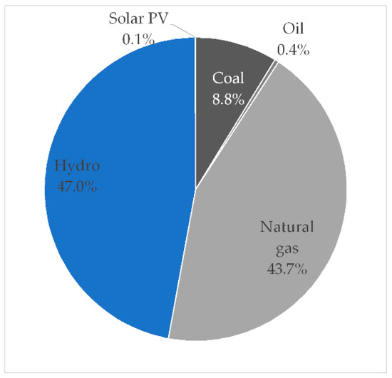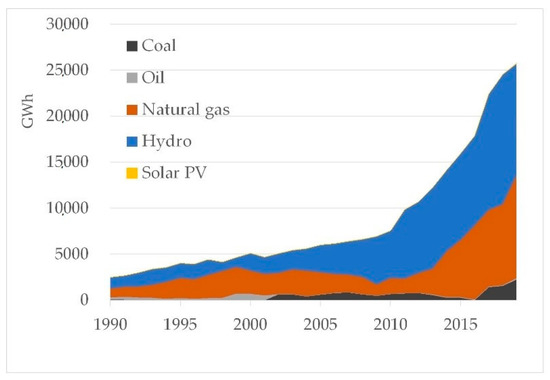 Hydroelectricity generation has played the largest role in the country (Figure 1 and Figure 2) because Myanmar has four major rivers (Ayeyawady, Chindwin, Thanlwin, and Sittaung) and 7.7% of Asia’s total hydroelectric generation resources [39]. The future potential capacity of large-scale hydroelectricity generation systems is 100 GW, and that of small- to medium-sized hydroelectric generation systems is 230 MW [40]. The current composition of the sources of electricity in Myanmar relies on hydropower; within the total electricity generated, hydroelectricity generation accounts for 56%, gas-fired power generation for 42%, and the only coal-fired power stations for 2.3% [41]. This reliance on hydroelectric generation leads to the occurrence of outages during the dry season [42]; because the generation capability falls in this season and because the capacity factor falls, there are outages, despite the fact that the installed capacity outstrips peak demand [41]. As a result, strengthening the electricity-generating capability of the country is urgently required.