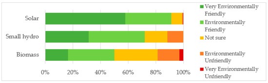 Figure 4 shows the answers to a question regarding whether respondents considered the different sources of renewable energy to be environmentally friendly or not. The majority of respondents considered solar energy to be environmentally friendly, with a total of 91% of respondents selecting either: “1. Very Environmentally Friendly” or “2. Environmentally Friendly”. The results were similar for small-scale hydropower, with the same combined percentage of 72%. However, the same combined percentage fell to 50% for biomass, with a total of 19% of respondents selecting “4. Environmentally unfriendly”, or “5. Very environmentally unfriendly”. Moreover, with a high 31% of respondents selecting “3. Not sure” (against 8% for solar power and 16% for small-scale hydropower), the knowledge level regarding biomass electricity generation is relatively low. This result was consistent with the answers if respondents knew about each renewable energy source shown at the bottom of Table 3. A total of 21% of respondents answered that they did not know about biomass, higher than 15% for small-scale hydropower and 3% for solar power. These results were considered reasonable.