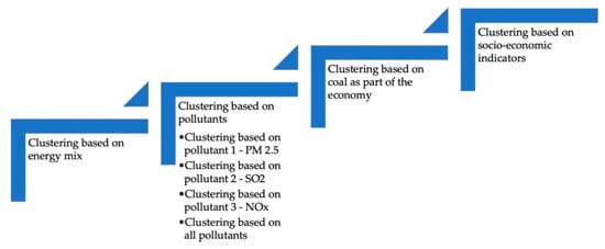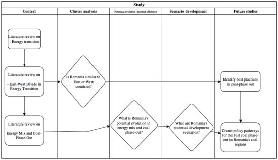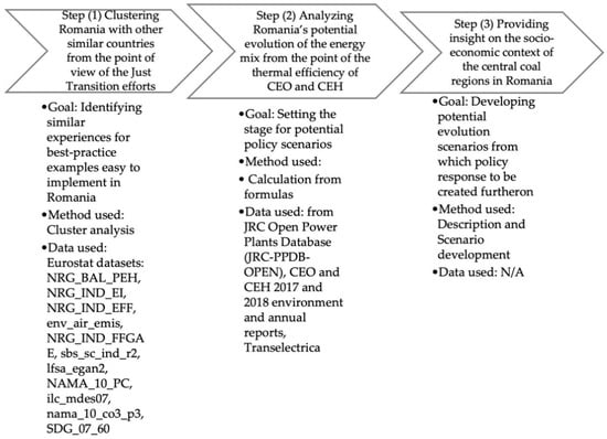 This article focused on possible scenarios to tackle this complex issue in Romania through a three-pronged methodology: (1) clustering Romania with other similar countries from the point of view of the Just Transition efforts (i.e., the energy mix and the socio-economic parameters), (2) analyzing Romania’s potential evolution of the energy mix from the point of the thermal efficiency of two major power plants (Complexul Energetic Hunedoara, CEH and Complexul Energetic Oltenia, CEO) and the systemic energy losses, and (3) providing insights into the socio-economic context (economic development and labor market transformations including the component on the effects on vulnerable consumers) of the central coal regions in Romania. To this extent, we have three different specific methodologies: related to cluster analysis, the evolution of thermal efficiency, and scenario development, and the methodological framework is presented in the following figures with the steps (Figure 1) and logical diagram (Figure 2).