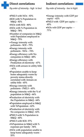 - Energy intensity directly correlated with pollutants (PM 2.5—65%, SO2—75%, NOx—74%), with the % of population in M&Q (64%) and indirectly correlated to GDP per capita (−62%);