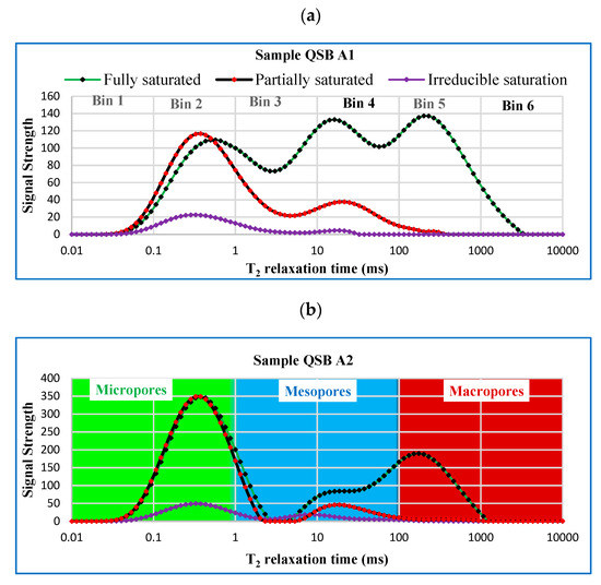 Nuclear magnetic resonance (NMR) T2 relaxation curves obtained in the laboratory for Sample QSB A1 (a), and Sample QSB A2 (b) under the three states of water saturation, i.e., fully saturated, partially saturated, and irreducible saturation.