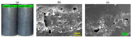 (a) The two studied samples; (b,c) Various pore types, i.e., micro, meso, and macropores inside the Sample QSB A1 and Sample QSB A2, respectively, under the scanning electron microscope. These SEM images only represent the qualitative situation of the internal pore space of the samples and the real bulk porosity was quantitatively measured by the NMR machine.