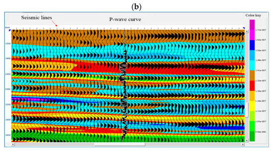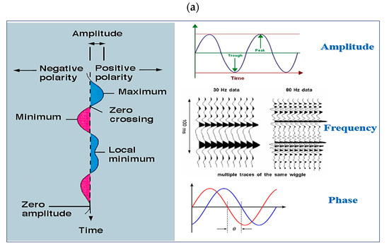 (a) The most significant components of a seismic trace; (b) Raw seismic data (Wiggle traces) and acoustic impedance inversion (color attribute) in the location of one of the studied wells overlain by the P-wave velocity from logging curve.