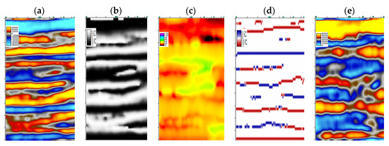 Two-dimensional (2D) seismic section passing through the employed well (a); and its four corresponding seismic attributes, including cosine of phase (b), instantaneous frequency (c), apparent polarity (d), and amplitude envelope (e).