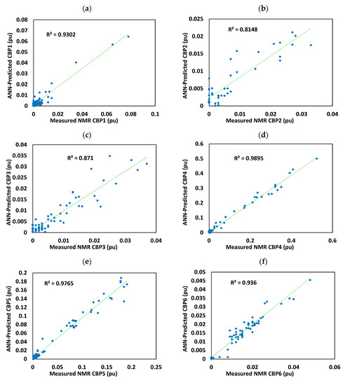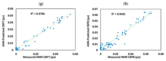 Correlations of the measured values of bin porosities with the predicted values (pu indicates the porosity unit): (a) CBP1; (b) CBP2; (c) CBP3; (d) CBP4; (e) CBP5; (f) CBP6; (g) CBP7; (h) CBP8.