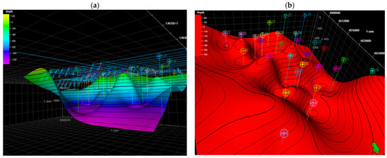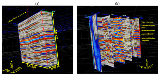 (a) 3D seismic cube used for extracting the employed attributes at the well location; (b) Employed seismic attributes.