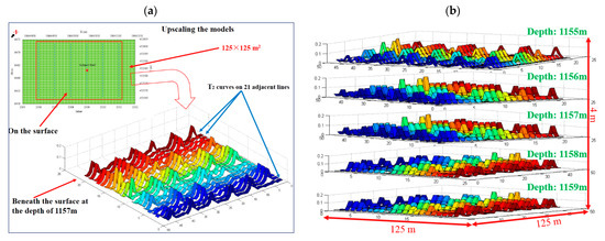 (a) The finally simulated T2 curves in the depth of 1157 m and their corresponding position on the surface; (b) Simulated T2 curves at various depths of the reservoir which could be estimated for any desired area around the well as far as no considerable geological changes happen.