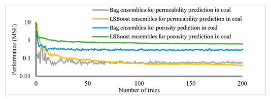 Prediction error versus the number of trees for statistical ensembles in the studied unconventional coal reservoir.