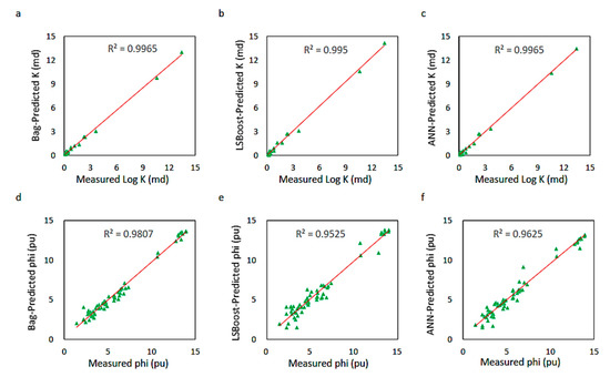 Correlations of the statistically and intelligently estimated permeability (a–c), and porosity (d–f) with the measured values in the unconventional gas field of the Qinshui Basin of China.