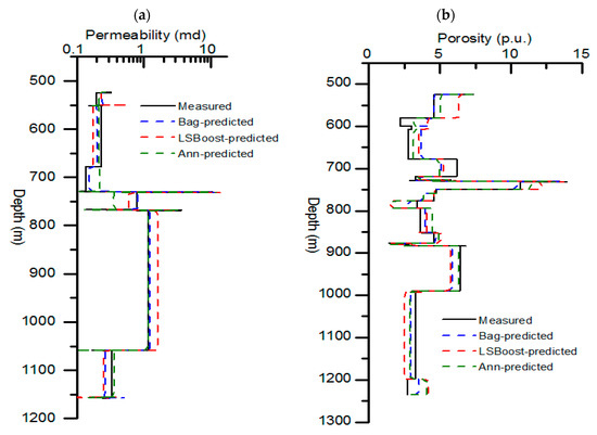 Measured (black), Bag-predicted (blue), LSBoost-predicted (red), and deep learning-predicted (green) curves of permeability (a) and porosity (b) in the unconventional coal reservoir. The stepped representation provides the comparison among the average permeability at different sections of the well, i.e., low permeable and highly permeable sections.