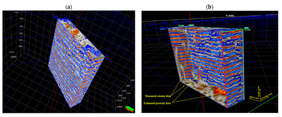(a) 3D porosity cube around one of the subject wells estimated using the statistical Bag ensemble; (b) Evaluation of the estimated porosity cube (right, front, and surface walls) using a measured 3D seismic attribute, i.e., frequency filter. The satisfying agreement of the statistical model’s result with the measured data proves the reliability of the technique.