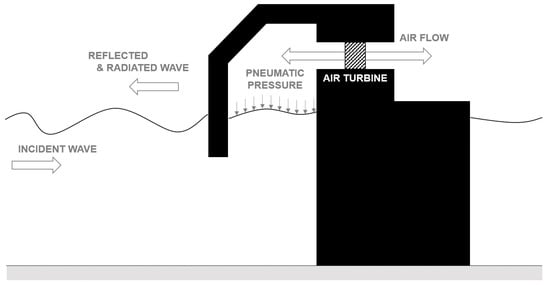 The pneumatic power take-off system using the air turbines is commonly used in the OWC system. Figure 2 shows the flow diagram of the wave–chamber–turbine interaction mechanism of an OWC-WEC. The OWC chamber contributes to converting wave energy into pneumatic energy, and in the next energy conversion step, this pneumatic energy is converted into mechanical energy through the turbine’s rotational motion. The pressure drop caused by the turbine operation affects the oscillating-water-column motion as a damping force acting on it. Therefore, the energy conversion performance of the chamber is considerably dependent on the interaction between the pressure drop and the water column motion.