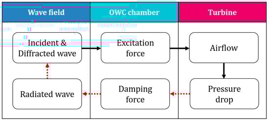 Flow diagram of wave–chamber–turbine interaction mechanism of an OWC-WEC.