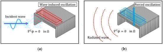 where and are the gravitational acceleration constant and the air density constant, respectively. is the radiation pressure used as the excitation pressure in the forced radiation simulation, which corresponds to the aerodynamic pressure drop due to the turbine rotation. Figure 3 shows the schematic diagram of the decomposed hydrodynamic problem for the oscillating-water-column, i.e., excitation and radiation problems.