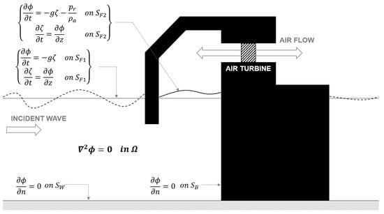 The potential flow theory is used to solve the hydrodynamic energy conversion problem of an OWC-WEC by assuming an inviscid, incompressible fluid and irrotational flow. Figure 5 shows a definition of the boundary value problem for the present study. It is assumed that an OWC chamber structure is fixed on the seabed, and airflow can only pass through a turbine. The velocity potential surrounding the OWC chamber structure could be defined in the fluid domain. The linearized boundary value problem for a given wave-structure interaction problem is as follows.