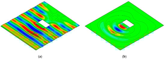 Wave fields around the OWC chamber in the three-dimensional numerical wave tank: (a) wave excitation simulation; (b) forced radiation simulation.