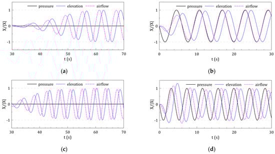 In the wave excitation simulation, the OWC chamber is modeled to allow the airflow caused by the free-surface oscillation to pass freely in and outside the chamber so that the Figure 7a,c shows the zero pressure drop. In the forced radiation simulation, the sinusoidal pressure variation excites the free-surface motion and produces the airflow. The oscillating airflow behaves out-of-phase with respect to the free-surface elevation. Additionally, the airflow is proportional to the vertical speed of the free-surface inside the chamber.