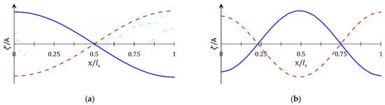 Longitudinal free-surface profiles of sloshing mode inside the OWC chamber: (a) first longitudinal sloshing mode, = 1.8 rad/s; (b) second longitudinal sloshing mode, = 2.5 rad/s; (solid line: crest, dashed line: trough).