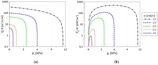 The excitation and radiation airflows can be calculated by applying with incident wave amplitude and with radiation pressure , respectively. The total airflow can be calculated using the phase differences with each decomposed airflow component based on Equation (7). The total airflow tends to gradually decrease as the radiation pressure increases in Figure 10a, and the available range of the radiation pressure is limited depending on the wave frequency. The pneumatic power calculated by the product of the total airflow and radiation pressure was also characterized as having an optimal value within the limited radiation pressure range, as shown in Figure 10b.