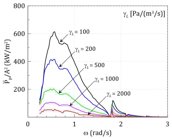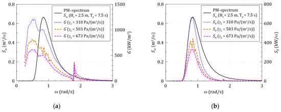 Figure 18a shows the pneumatic power transfer function and wave spectrum applying three arbitrary linear pressure drop. The response spectrum calculated by the product of the wave spectrum and transfer function based on Equation (27) is shown in Figure 18b. The transfer function’s peak frequency is lower than that of the wave spectrum, as shown in Figure 18a. Nevertheless, it can be seen that the peak frequency of the response spectrum is dependent on the wave frequency. In order to increase the pneumatic power under irregular waves, not only the pressure drop that can increase the magnitude of the transfer function must be applied, but it is also important that the peak frequency coincides with the peak frequency of the wave spectrum.