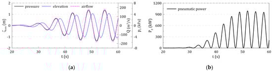 Figure 12 shows the time-series data of the OWC chamber responses in a wave excitation simulation with DIM. The pressure drop is in-phase with the airflow, which corresponds to the out-of-phase free-surface elevation, as shown in Figure 12a. The pneumatic power has a positive value in Figure 12b, which can be calculated as the product of the in-phase airflow and pressure drop. Each time-series response is confirmed to converge to a quasi-steady state after a certain period.