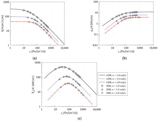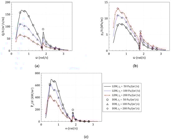Figure 13 shows the comparison of the simulation results between the LDM and DIM according to the change of the linear pressure drop coefficient (). The pneumatic responses of LDM are calculated for various radiation pressures based on the excitation airflow coefficient () and radiation admittance () derived through wave excitation and forced radiation simulations under the three-wave frequencies, 1.0, 1.5, 2.0 rad/s. For these wave frequencies, the DIM simulations were performed applying various linear pressure drop coefficients, and these are expressed as symbols in Figure 13. It was confirmed that the simulation results of LDM agree well with the DIM results at the wave frequencies regardless of the linear pressure drop coefficient.