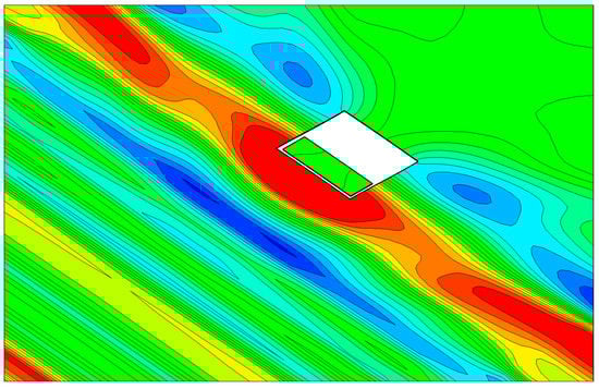 The radiation problem deals with the excitation force and resulting energy dissipation by the radiated waves outward on the calm water. In this case, the excitation force corresponds to the oscillating aerodynamic pressure acting on the free-surface inside the chamber. The excitation (or scattering) problem deals with the oscillating-water-column motion caused by the incident waves when the aerodynamic pressure is set to zero. Figure 6 shows the wave fields around the OWC chamber under both wave excitation and forced radiation simulation in the three-dimensional numerical wave tank, in which the numerical grid of the computational fluid domain constructed based on the recommendation of [] corresponds to 81,855 nodes and 70,916 elements. The dimension of the OWC chamber model corresponds to water depth 16.5 m, breadth 34 m, and front wall depth 2 m.