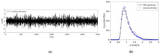 The irregular waves were generated in the three-dimensional numerical wave tank based on the Pierson–Moskowitz spectrum [] in Equation (26):