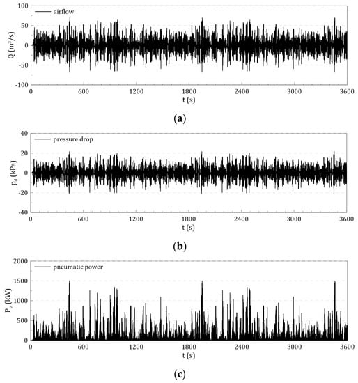 Time-series pneumatic responses of the OWC chamber from irregular wave simulation with the direct interaction method (DIM): (a) airflow; (b) pressure drop; (c) pneumatic power.