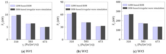 Figure 19 shows the comparison results of the mean pneumatic power under irregular waves between the LDM-based RSM and DIM-based irregular wave simulation. The numerical simulation results of both methods show good agreement within the 5% relative error range under all nine simulation conditions. Therefore, it can be seen that the LDM-based RSM is quite a practical method for estimating the hydrodynamic performance of the OWC chamber connected to the Wells turbine under irregular waves. The application of this method is expected to contribute to reducing the computational time for numerical simulation.