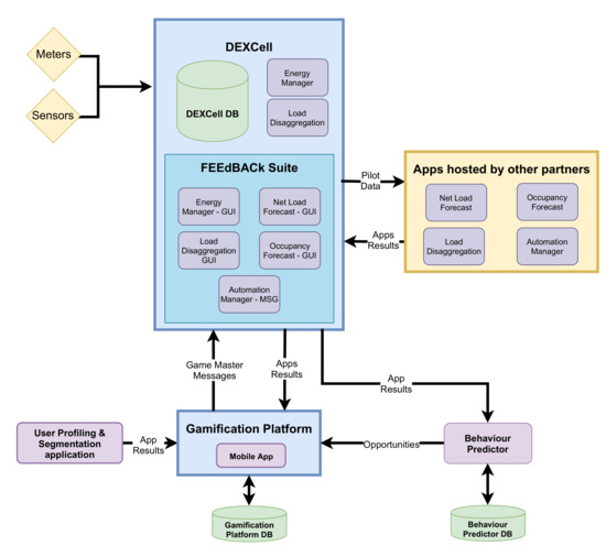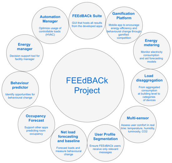 Besides FEEdBACk, a number of recent projects have aimed to increase energy efficiency through behavioral change using ICT solutions. Among these projects, the eTEACHER project (http://www.eteacher-project.eu/, accessed on 15 February 2021) also focused on the end-user, used gamification techniques and sensors, and provided tailored advice to building users. However, with regard to engineering, no advanced algorithms such as the ones proposed in FEEdBACk were envisioned (e.g., none of their algorithms use forecasting techniques). Another noteworthy project is inBETWEEN (https://cordis.europa.eu/project/id/768776 accessed on 15 February 2021), which also lacks the advanced algorithms proposed in FEEdBACk and has inferior use of sensors. Finally, in the UtilitEE project (https://www.utilitee.eu/ accessed on 15 February 2021), the building automation component dominates the project, but neither gamification nor algorithms using forecasting techniques were integrated. The remainder of this paper is as follows: in Section 2, the objectives, concepts, and methodology of FEEdBACk are provided; in Section 3 the data management and monitoring of energy and comfort are addressed; in Section 4, the segmentation of building user profiles are detailed; in Section 5, the gamification platform is presented; in Section 6, new ICT and data analysis applications developed in FEEdBACk are detailed; and in Section 7, conclusions are drawn and directions for future work are proposed.