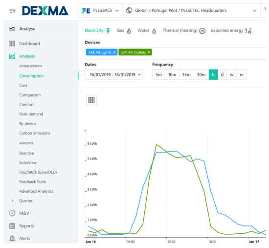 These data were sent via HTTP REST API in JSON format to DEXCell (as detailed in Section 3.1), thus allowing us to share information with other partners not only through custom graphics but also through its own API. Figure 4 represents an example of the data collected from meters and visualized using the FEEdBACk suite presented in Section 3.1.