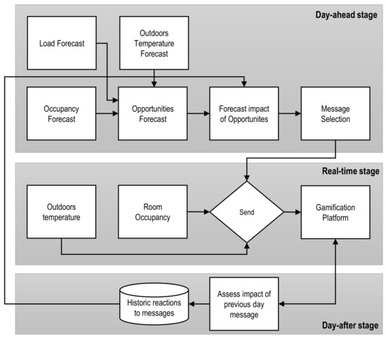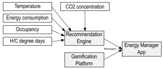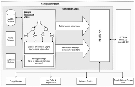 The gamification platform is embedded in a broader ICT-based platform for energy efficiency with an interactive energy management system, which aids interested stakeholders in optimizing “when and at which rate” energy should be buffered and consumed, with several advantages, such as reducing peak load, maximizing local renewable energy consumption, and delivering more efficient use of the resources available in individual buildings or blocks of buildings. This system also interacts with an automation manager and a users’ behavior predictor application.